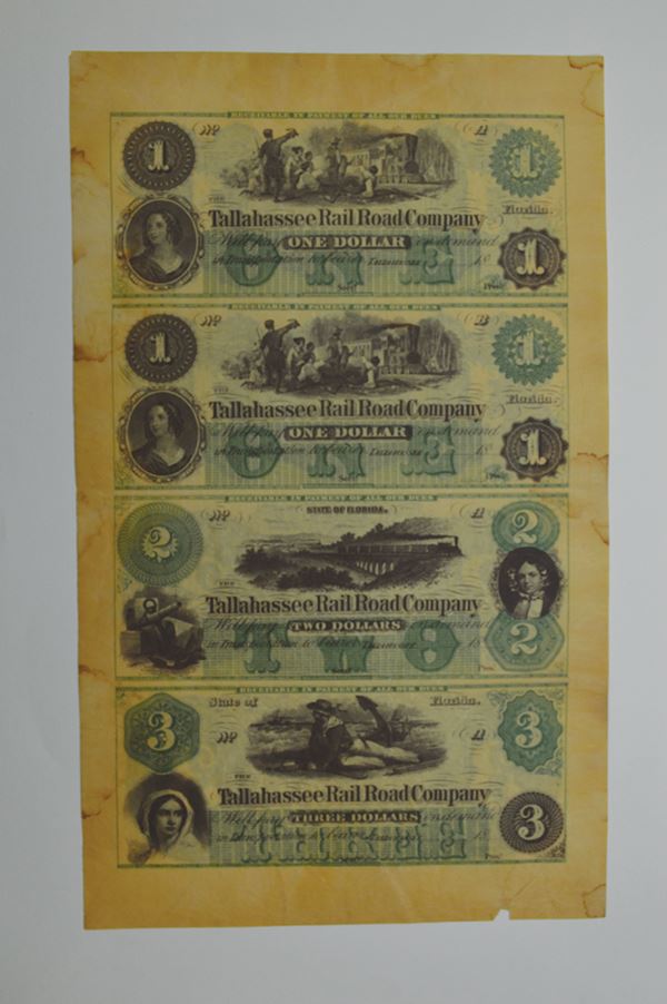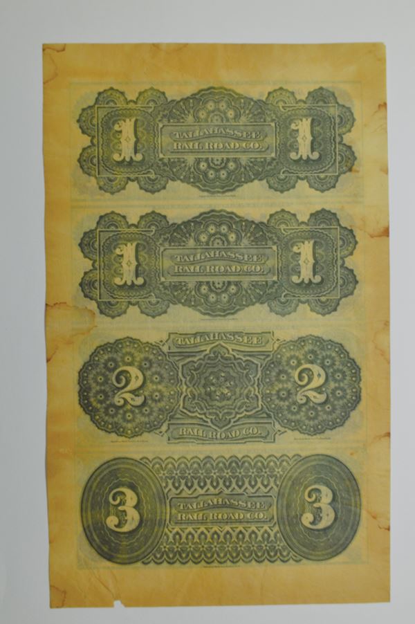Florida. Tallahassee Rail Road Co. Uncut Sheet 1-1-2-3 format. Stains at edges. Tear at bottom edge nearly 1 inch but not attesting note designs. Very Fine.