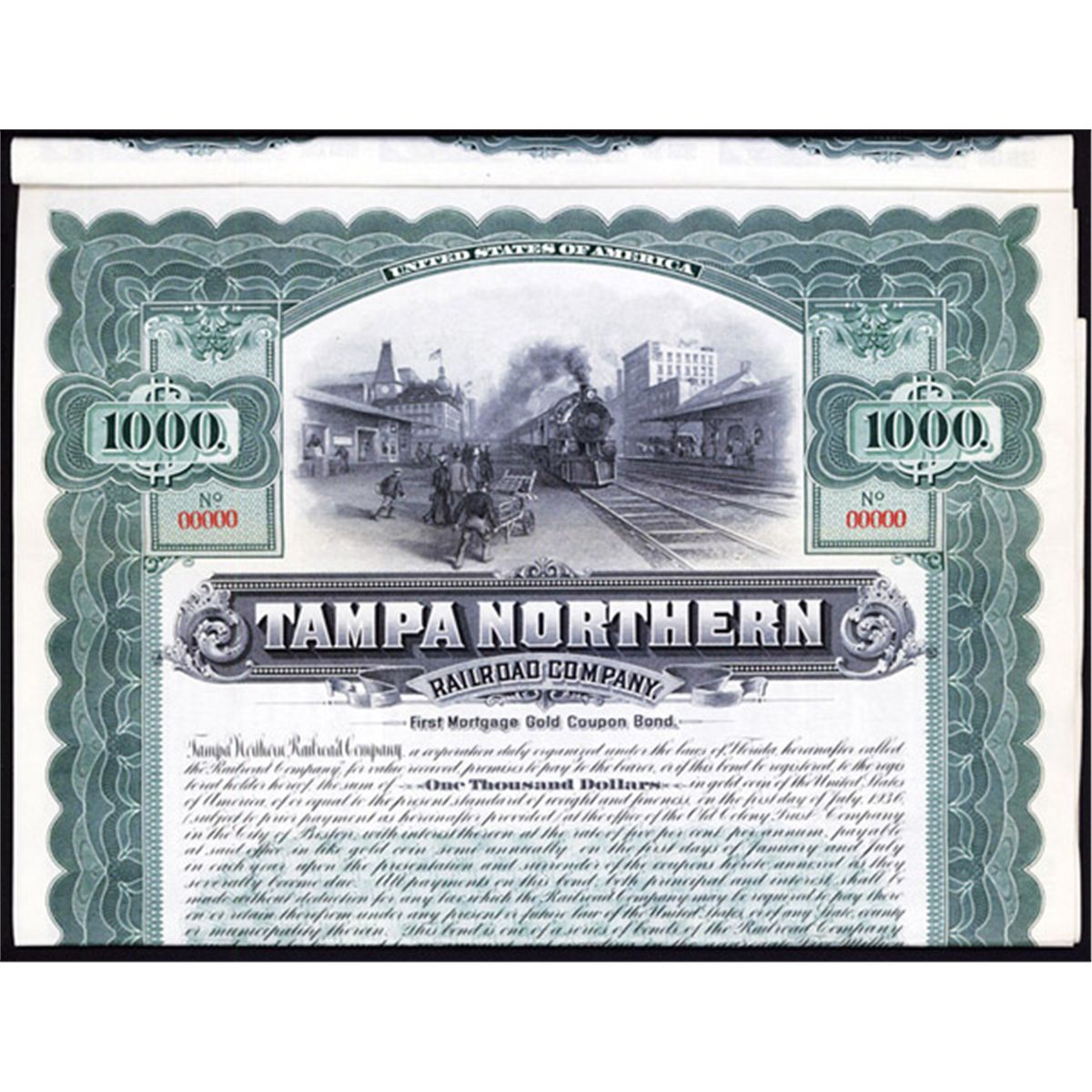 Florida, 1906, $1000, 5% 1st Mortgage Gold Coupon Specimen Bond, Black on green border and underprint, Locomotive arriving at station top center, Coupons attached, VF-XF condition, ABNC.