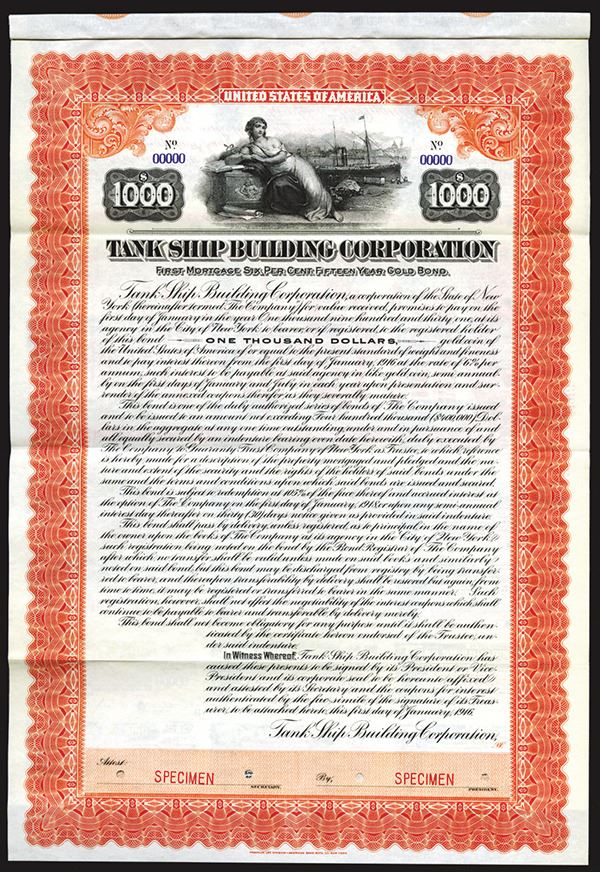 New York, $1000, 1st Mortgage 6% Gold Coupon Bond, Allegorical woman with steamship at dock. Orange border. VF-XF condition. FLD-ABNC.