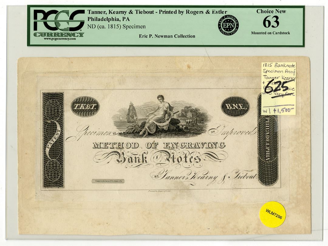 Philadelphia, PA. "Specimen of an Improved Method of Engraving Bank Notes", by Tanner, Kearny & Tiebout, Seated allegorical woman by shoreline with ship in the background, "Patent" in left counterfoil, Printed thin india type of paper mounted on thin manila card. Uncirculated with extremely light foxing. This three-partner imprint was very short-lived, but in that period the firm engraved and printed some beautiful banknotes. Benjamin Tanner may have studied with Peter Maverick and created some large plate engravings of War of 1812 scenes. Francis Kearny, supposedly the nephew of hero Commodore Lawrence, went back into private engraving in 1820. Cornelius Tiebout studied in London with James Heath. An India paper proof, printed to thin, wide margined card stock by Rogers & Estler (their imprint under the frame line). Flanking are oval dies with "T.K.& T." left and "B.N.E." at right. One of the earliest engraving company sample notes known.(Ex - Eric P. Newman Collection, Heritage Auction #3568)