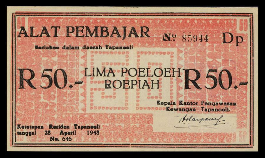 Indonesia, 28 April 1948, 50 Rupiah, P-396b, Number 646 on lower left, Black on pink, back with printed purple signatures, PMG graded Very Fine 30 with claims to Choice condition. Scarce note.