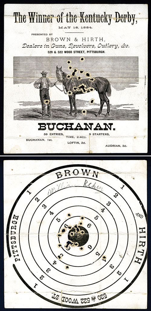 Pittsburgh, PA. 1884, Brown & Hirth, “Dealers in Guns, Revolvers, Cutlery, etc., advertisement on one side and bulls eye target on the other that has been used for target practice , The ad is labled “The Winner of the Kentucky Derby “ with Man holding “Buchanan “ winner of the 1884 Kentucky derby on front and Pistol-Rifle Gun target on back, VG condition with 19 Bullet holes from target practice. Unique Horse Racing as well as Gun Related ephemera.