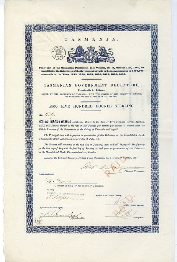 Tasmania. Tasmanian Government Debenture, 1867, £500 Sterling, Blue-black, British Royal seal, issued, paid. S/N 1139, Small stain in the bottom margin, otherwise EF. Rare early Australian related fiscal documents. On 1 January 1901, the Colony of Tasmania, became the Australian state of Tasmania.