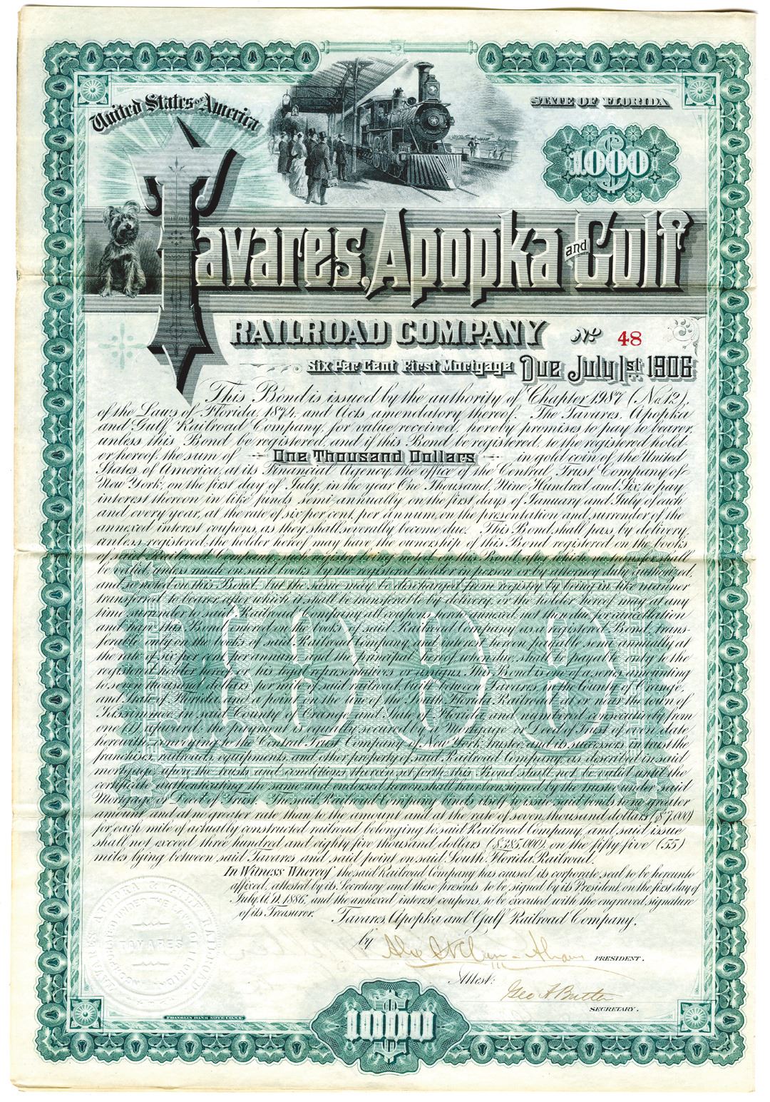 Florida, 1886. $1000 I/U 6% First Mortgage Coupon Bond, S/N 48, Black text with green border and undertint, Train arriving at station with waiting passengers at top center. Fine condition, slight toning along margins, FBN.