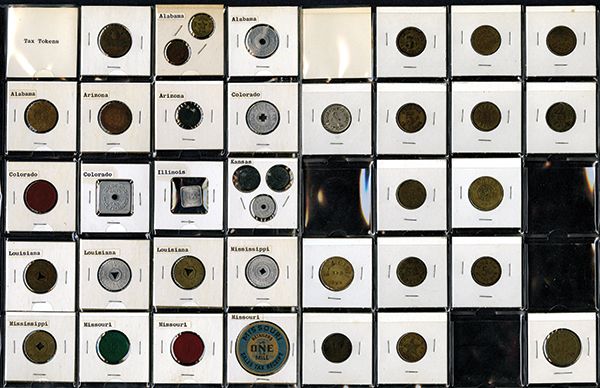 Tax Tokens and Good Fors Assortment. Over a dozen states are represented. Plastic, aluminum, bronze and wood. [47], weight approximately 1 lb.