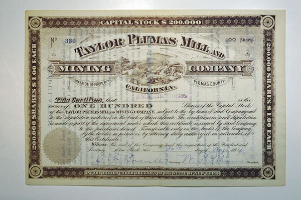 Location of Property, Plumas County, CA. 100 Shrs, I/U, Brown with no underprint, Miners in middle. VF-XF.