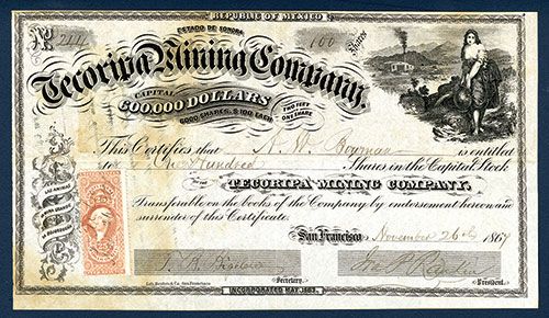 Mexico, 1864, 100 Shares, Issued Stock, Topless woman carrying jug of water in front of mine top right, VF condition, Lithography Britton & Co.