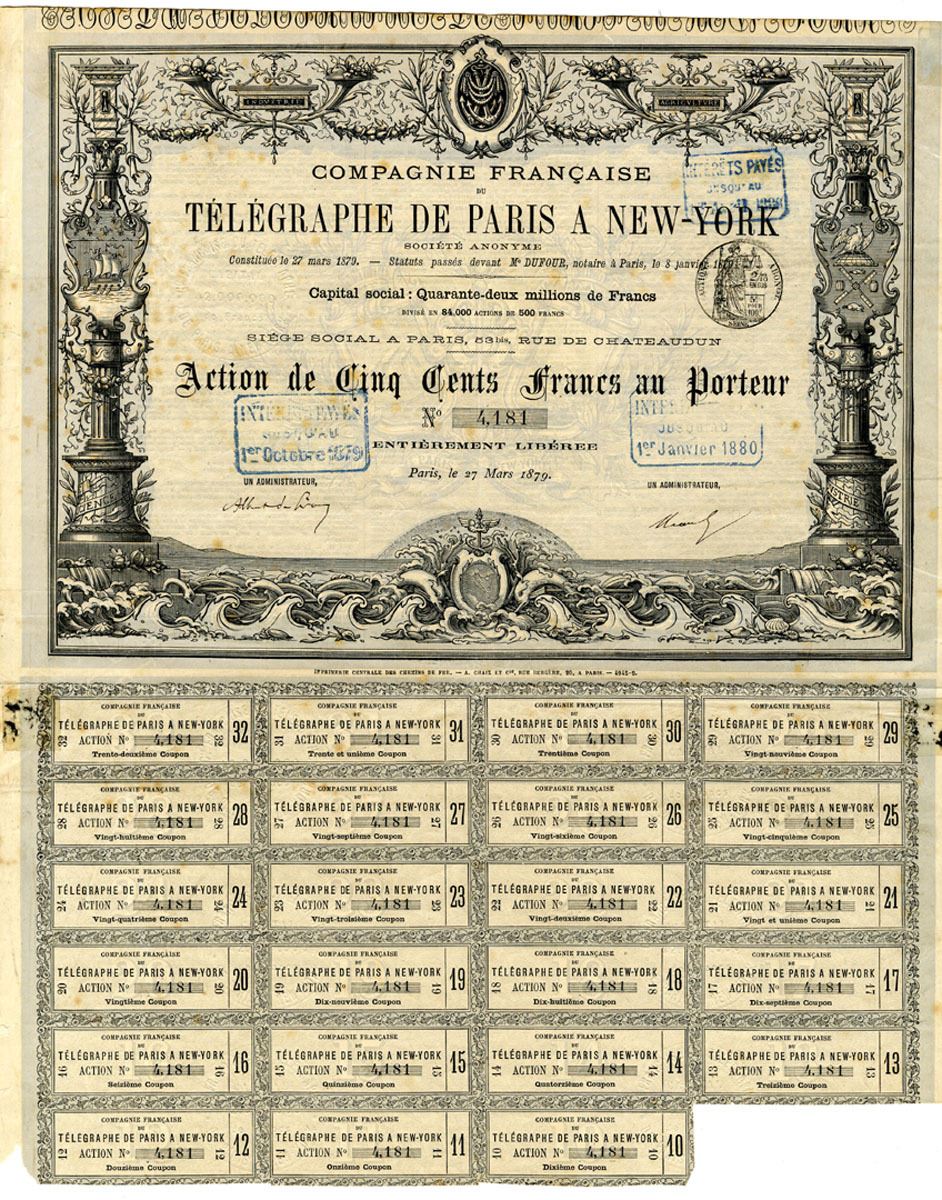 France and New York, 1879, 500 Francs, I/U bond, Early transatlantic cable, coupons attached, ornate border. Scarce telegraph related bond