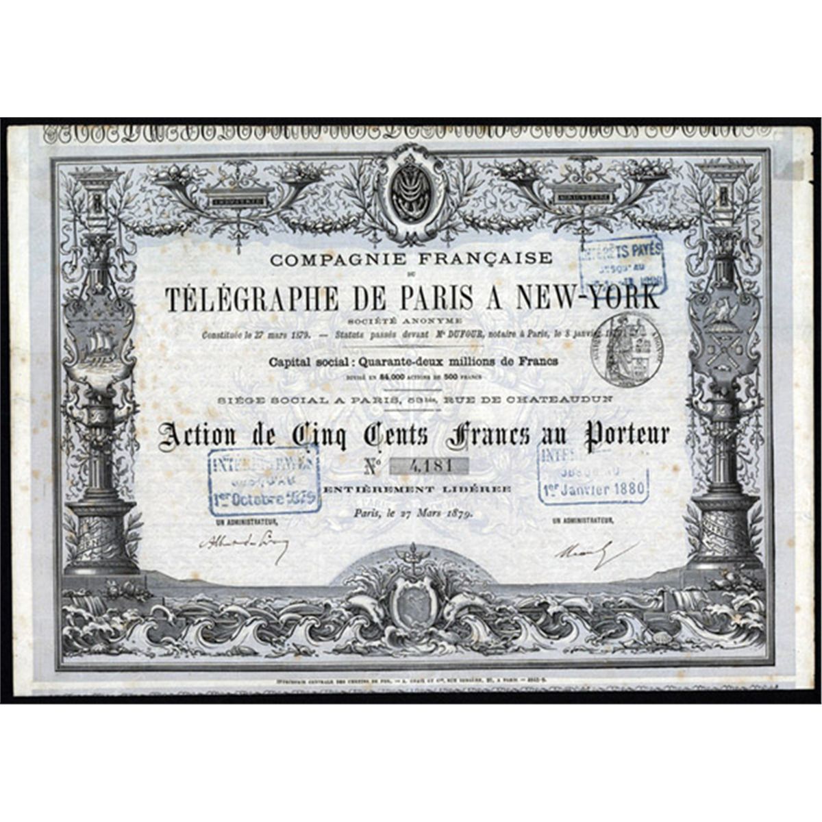 France, 1879, 500 Francs, Issued bond, Early transatlantic cable, coupons attached, ornate border. Scarce telegraph related bond