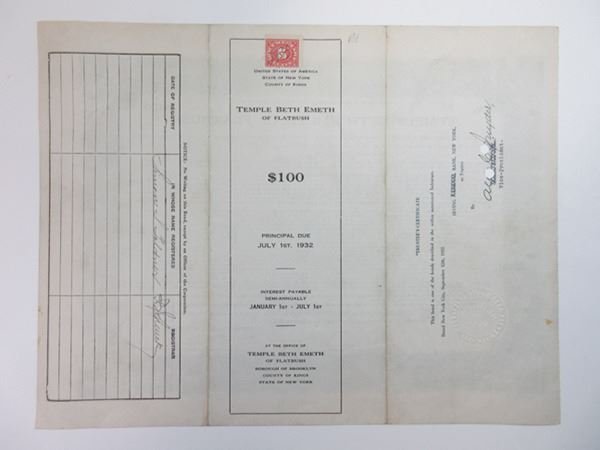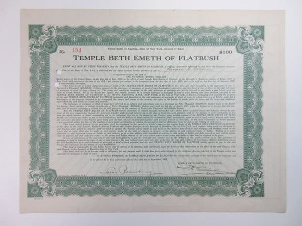 Brooklyn, New York. $100 Issued and Cancelled Bond, Black print on green border and under tint, Temple name at top, Fine-VF condition, Goes. Temple Beth Emeth was one of the first Liberal Reform congregation.