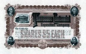Tennessee, 1896, $5. 1 Share. Unissued and unsigned Stock Certificate. Striking design with Brown border and underprint with black vignettes and text. Includes the Nashville Parthenon on the upper left with the 4 corners with portraits of Jackson, Johnson, Sevier and Polk. XF. The Tennessee Centennial Exposition, held in Nashville in 1897 to celebrate Tennessee's one-hundredth anniversary of statehood, was one of the largest and grandest of a series of industrial expositions that became hallmarks of the New South era. Modeled in particular after the Chicago Columbian Exposition in 1893, it featured exhibitions on the industry, agriculture, commerce and transportation of the state as well as displays on the educational and cultural achievements. The state's centennial celebration did not begin until one year after the one-hundredth anniversary of statehood due to the effects of the 1893 depression,. A group of Nashville businessmen took the lead in planning the exposition, and the Louisville and Nashville Railroad provided major backing for the event, which became, in part, a public relations effort to appease widespread public discontent with the railroad monopolies. Rare Expo certificate and first time offered by us.