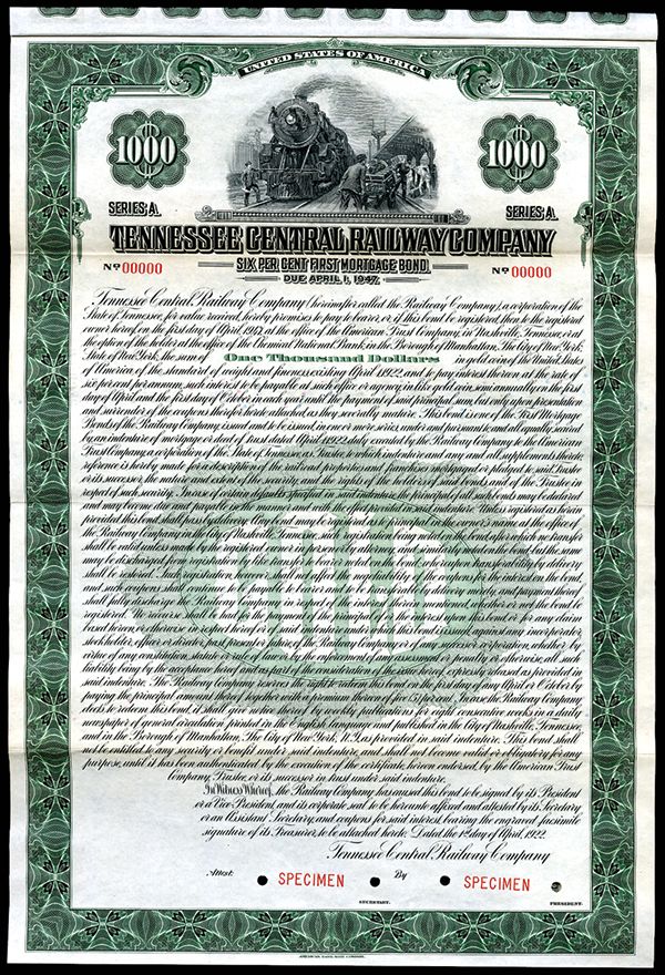 Tennessee Central Railway Co. 1922 Specimen Bond. Tennessee, 1922, $1000, Specimen Ser.A, 1st Mortgage 6% Gold Coupon Bond, Black on green and light green underprint, Train at station with porters with baggage carts, Specimen overprint, XF condition. ABNC. This is the plate certificate used in Cox from my previous auction in 2008.