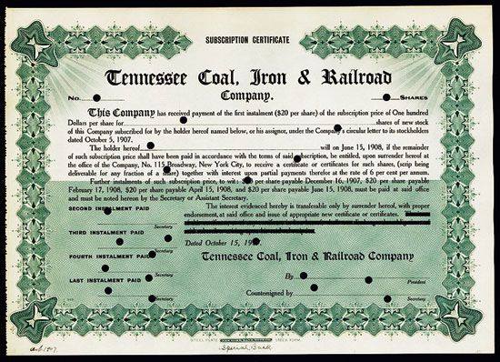 Tennessee, 1907, Specimen Stock, Black on green border and underprint, No vignette, POC's, VF condition, NYBNC. Was one of the first companies on the Dow Jones Industrial AveRage in 1896. In 1907 TCI became a subsidary of US Steel after J.P Morgan succesfully decided to take over his southern rival. This subscription cert. is from that transaction.