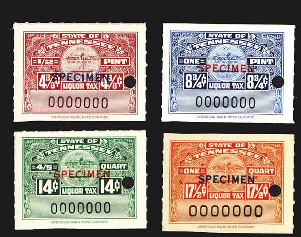 TN. Tennessee Liquor Tax Stamp. 4-3/8c, 8-3/4, 14c, 17-1/2c. SPECIMEN on face, POC. ABNC. On light weight card stock. 4 pieces.
