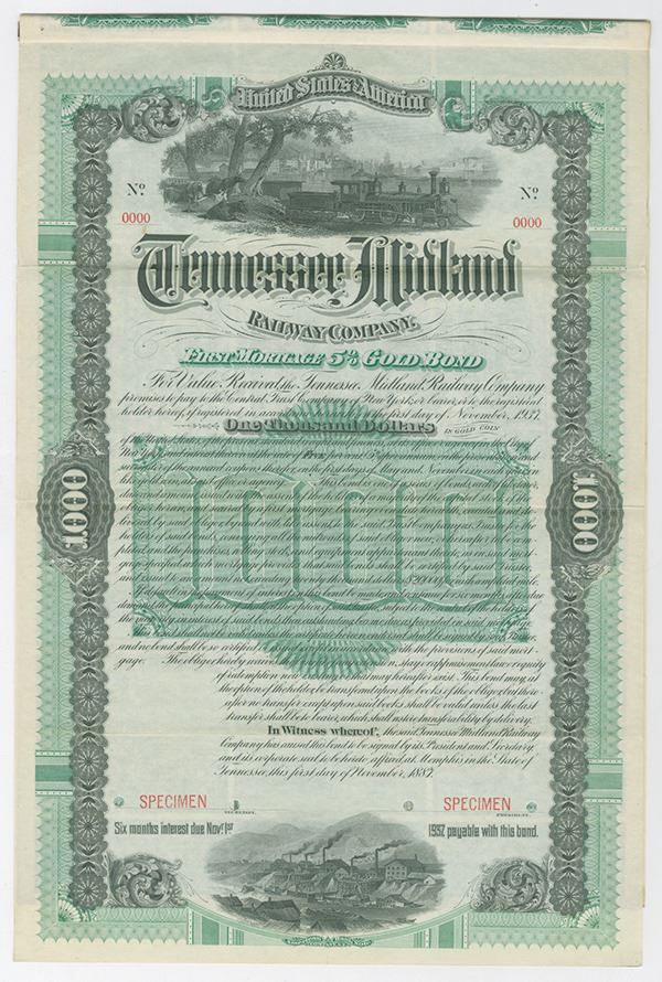 Tennessee. $1,000 Specimen 5% 1st Mortgage Gold Coupon Bond, Black print on black and green ornate border and green under tint, Locomotive passing cattle and trees at top, mine at bottom, Specimen overprints and POC's, Fine-VF condition with minor toning around edges, ABNC. Only known as a specimen.