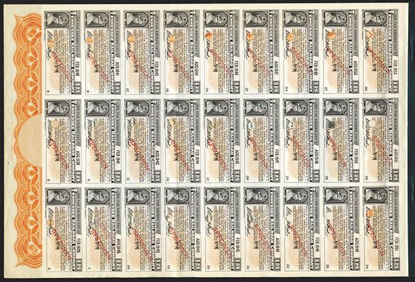 Tennessee. $1000, Specimen 5% First Mortgage Coupon Bond. Black ink with orange border and under print. Vignette of locomotive at center. Specimen overprints, POC's, coupons numbered 1-3 have been cut off. VF, SBNC.