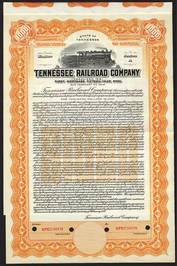 Tennessee. $1000, Specimen 5% First Mortgage Coupon Bond. Black ink with orange border and under print. Vignette of locomotive at center. Specimen overprints, POC's, coupons numbered 1-3 have been cut off. VF, SBNC.