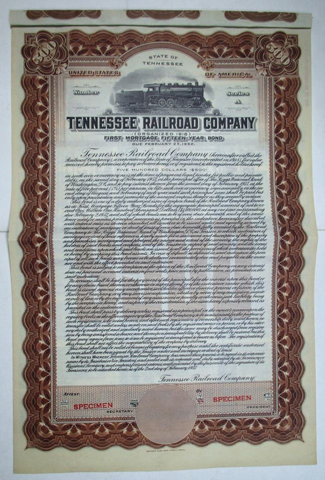 Tennessee, 1937. $500 Specimen 5% First Mortgage Coupon Bond, Black text with brown border and underprint, Profile of a train on tracks at top center. Red specimen overprints and POCs. VF-XF condition, SBNC.
