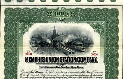 1913. $1,000. Specimen 1st Mortgage 5% Gold Bond. Green border. Trains at station with ships in background. Red specimen overprints, POC's and "00000" serial numbers. XF condition. Unlisted railroad in Cox. Rare certificate. ABNC