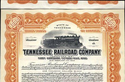 1937. $1,000. Specimen railroad bond. Locomotive and coal car facing right. 1st Mortgage 15 Year Bonds. Orange border. Unlisted railroad in Cox. SBNC.