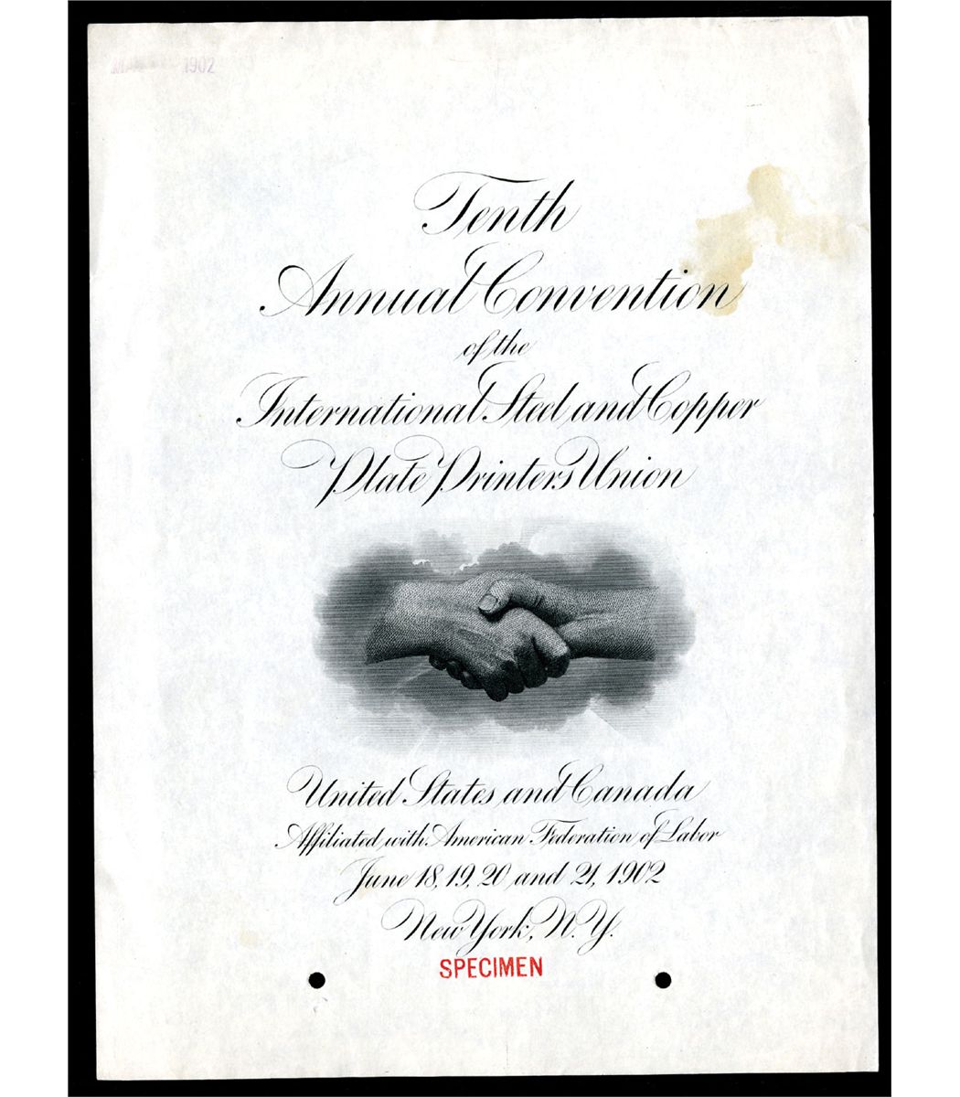 New York, 1902, Inner front page Specimen printed by ABNC with image of two clasped hands, VF condition with stain on upper right. Rare Convention booklet Specimen ABNC plate.