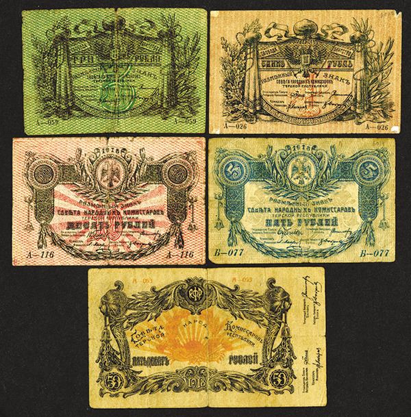 Russia - North Caucasus. 1, 3, 5, 10, 50 Rubles. P-S529, S530, S531a, S532, S534b. First with paper pulls from corner mounting, and one corner with paper loss, Otherwise nice Very Good-Fine group. 5 pieces. (The Silicon Valley Collection)