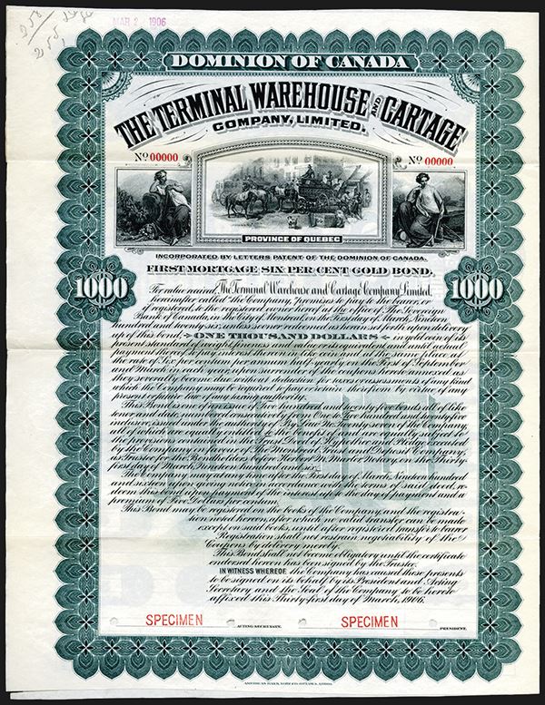 Quebec, Canada. $1000 Specimen 6% Gold Bond, Black on green, allegorical women flank men loading wagon. VF, ABNC.