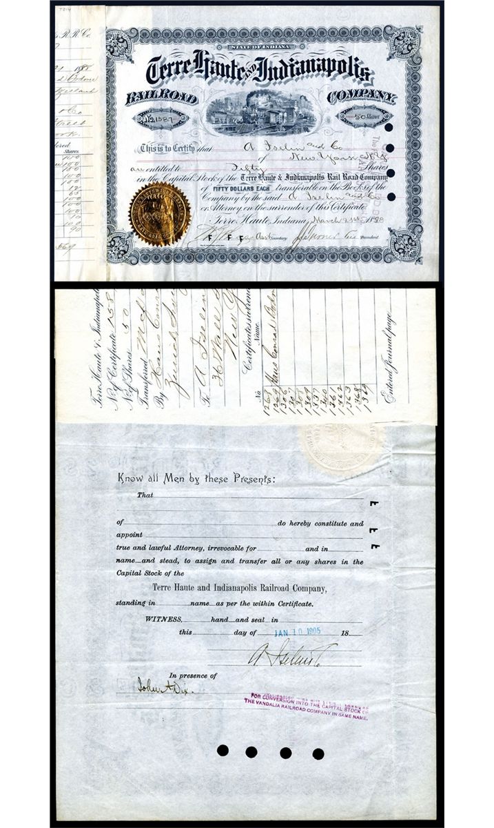 Terre Haute, Indiana, 1898, Terre-Haute and Indianapolis Railroad Company Cert# 1587, Sh. Issued Punch Cancelled Shares, Vf Condition.