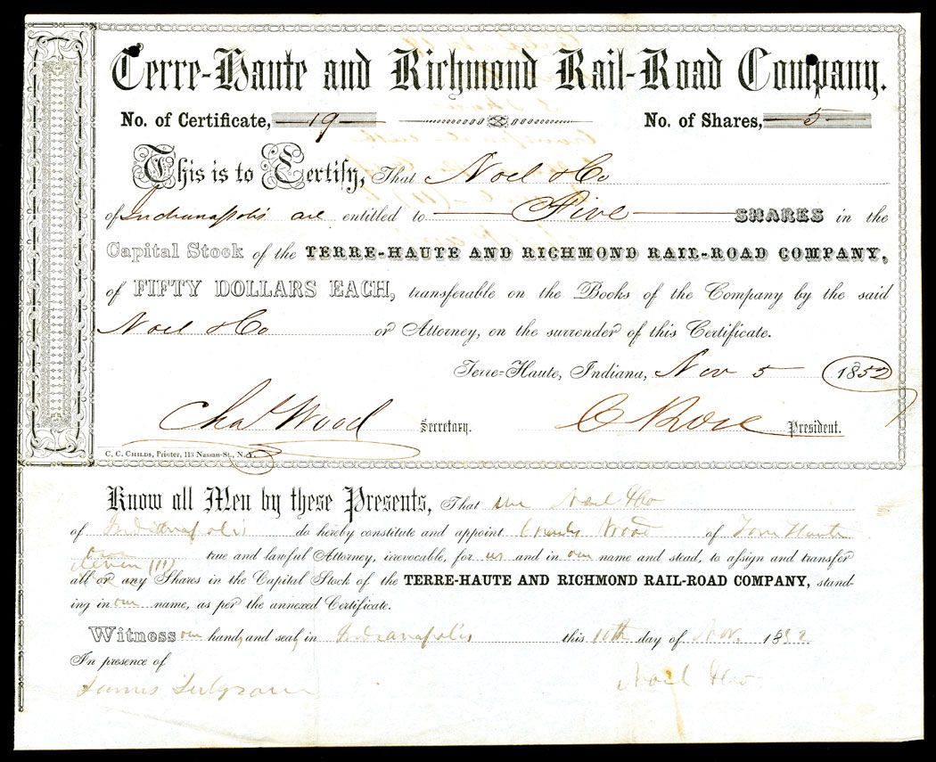 Terre Haute, IN, 1852 Terre-Haute and Richmond Rail-Road Co. Cert. #19, 5 Shares Stock Certificate, VF, Punch Hole Cancelled.