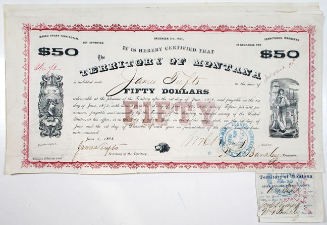 Montana Territory, 1868, 4 pieces: Pair are $100 I/C 15% Coupon Bonds, Black text with blue border and underprint; Another Pair are $50 I/C 15% Bonds, Black text with red border and underprint. Both are in Fine-VF condition. All signed by James Tufts as Secretary of the Territory. James Tufts (September 19, 1829–August 18, 1884) was a United States politician and acting governor of Montana Territory in 1869. (4)