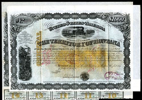 Montana, 1876, $1000-$500, Issued and Cancelled Bonds, #65-#20, Black print with ornate black border and gold denomination underprint, Moving locomotive l-r passing by tribe of Native Americans top center, Vertical mining vignette on left border, VF condition lot of 2, New NorthWest Lith Agency.