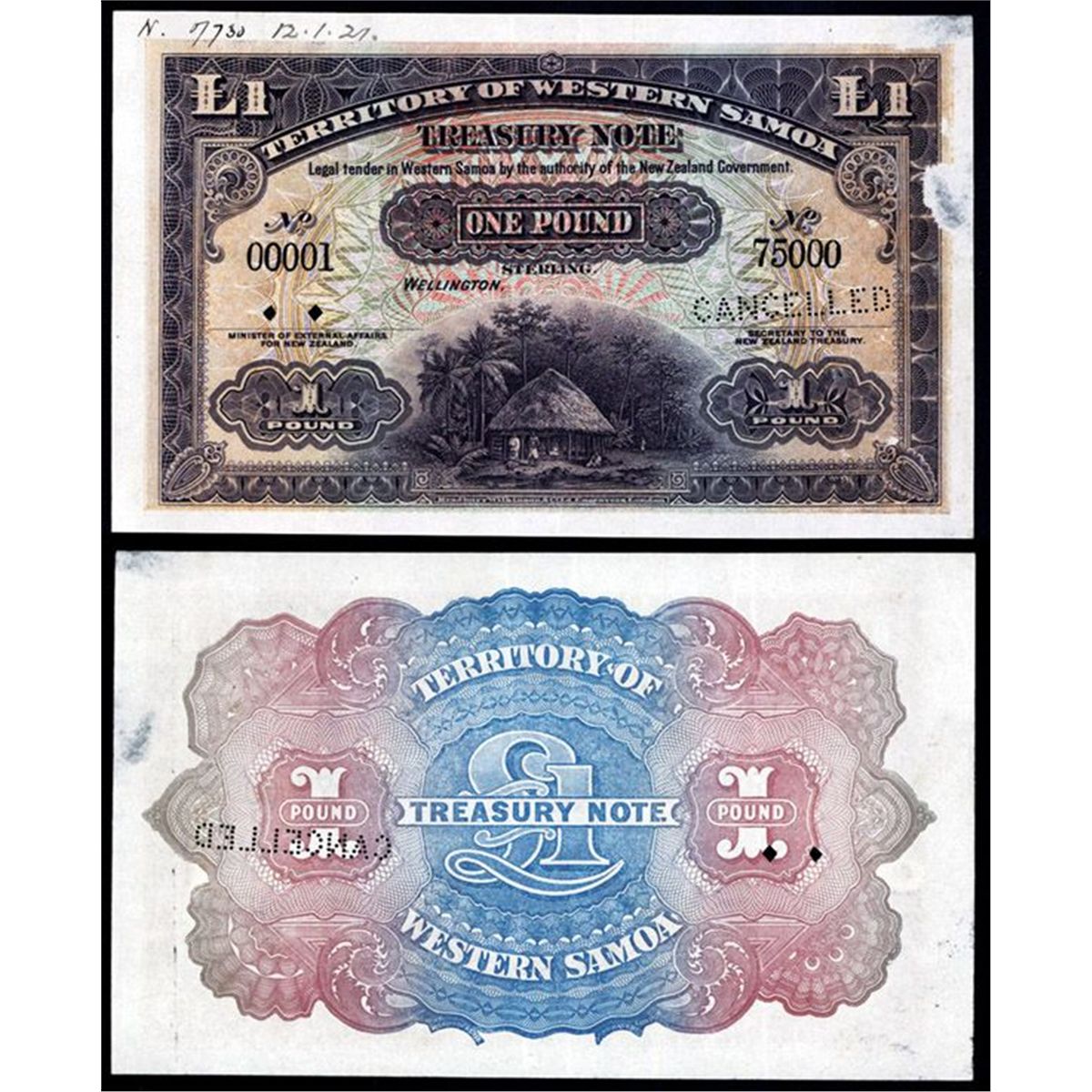 Western Samoa, ND (1921), £1, P-8 Unlisted specimen with archival date of 12.1.(19)21 (the date of the first printing) written on top margin, first issue Bradbury Wilkinson master specimen, serial #00001 and 75000, denoting a print run of 75000 notes (which in fact lasted for 20 years until WWII in the Pacific), order #730 in manuscript at top. A unique printing. Small surface disturbance at right apparently from glue in the master record books. BWC. Rare and attractive note,