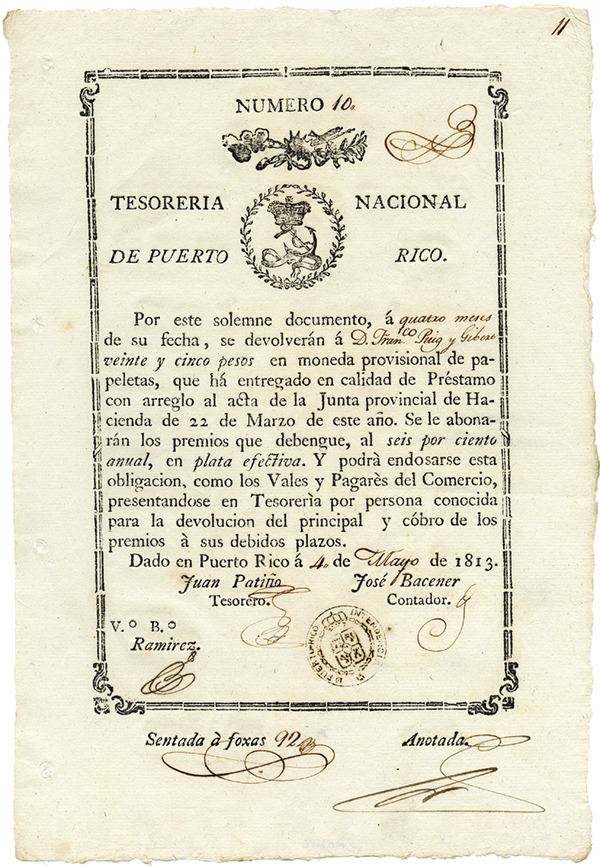 Puerto Rico, 1813, 25 Pesos, I/U, 7% Bond payable in silver, S/N 10, AU-Uncirculated. Rare and historic Puerto Rico bond. (From the collection of John E. Herzog).
