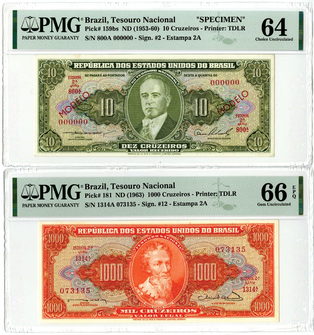 Brazil. Lot of 2 pieces: ND (1953-60), 10 Cruzeiros, P-159bs, Specimen banknote, Green and multicolor, S/N 800A 000000, Sign. #2 - Estampa 2A, PMG graded Choice Uncirculated 64; ND (1963), 1000 Cruzeiros, P-181, Issued banknote, Orange and multicolor, S/N 1314A 073135, Sign #12 - Estampa 2A, PMG graded Gem Uncirculated 66 EPQ. Both were printed by TDLR. (2)