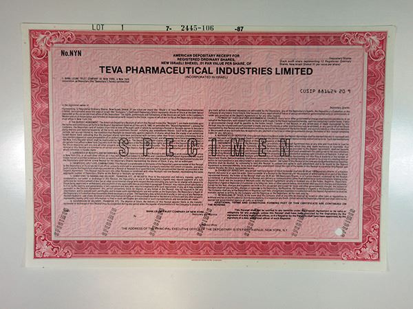 Israel, 1987. Odd Shares Specimen American Depositary Receipt Stock Certificate, Black text with pink border and background. Specimen overprints and POCs. VF condition, ABNC. Teva Pharmaceuticals is an American Israeli pharmaceutical company that specializes primarily in generic drugs, but other business interests include active pharmaceutical ingredients and proprietary pharmaceuticals. It is the largest drug manufacturer in the world, and one of the 15 largest pharmaceutical companies worldwide.