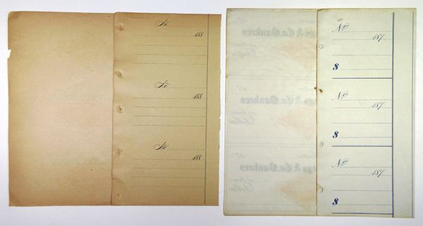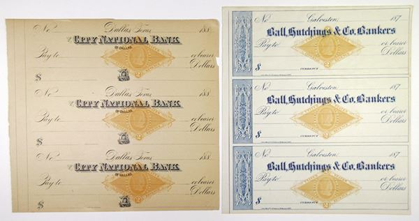 Texas, Lot includes 2 Uncut Sheets of 3 Checks. Includes 1870's, Galveston, TX. Ball, Hutchings & Co. Bankers, Blue text with blue border; and 1880's, Dallas, TX. City National Bank of Dallas, Black text without border. Both are in Fine-VF condition. (2 sheets of 3 checks)