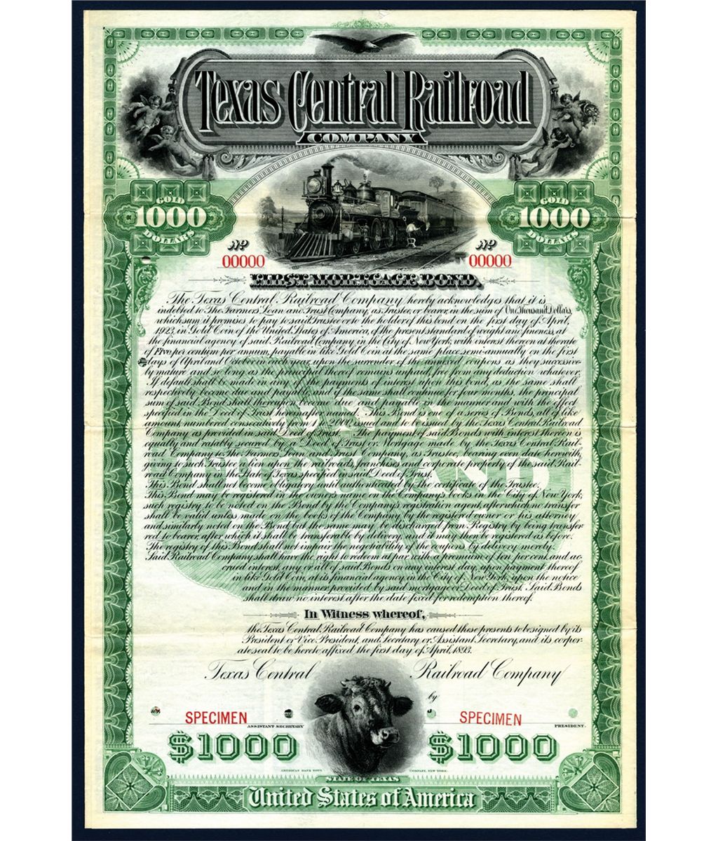 Texas, 1893, $1,000. 1st Mortgage 6% Gold Bond. Green border and underprint locomotive with flagman in middle flanked by cherubs holding up title on top and steer on bottom. ABNC. Specimen w/ coupons, POC's. Rare, Attractive and a great Texas Bond. Only 3 found in the archives.