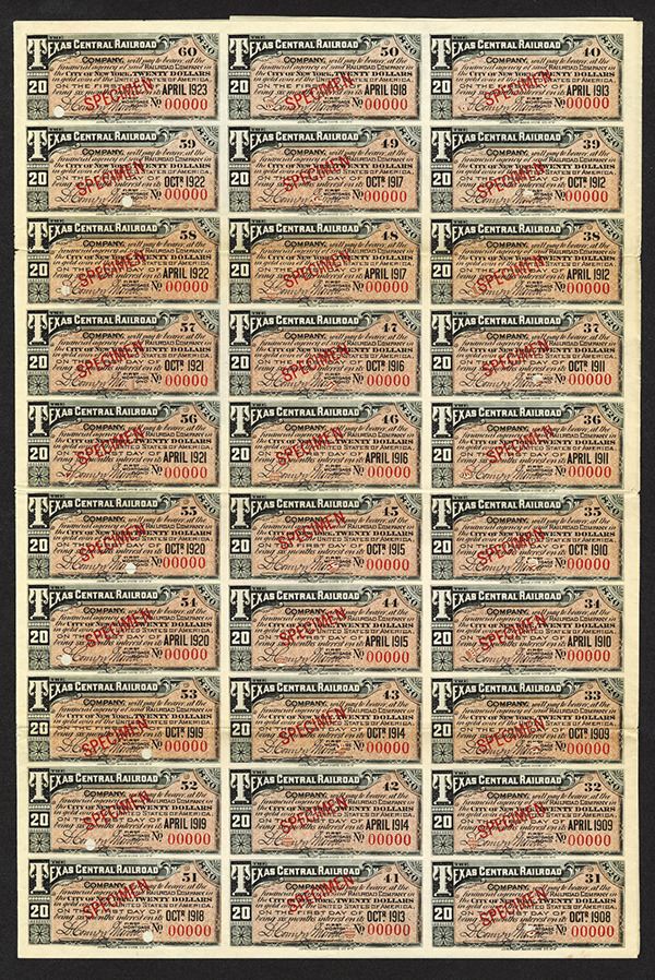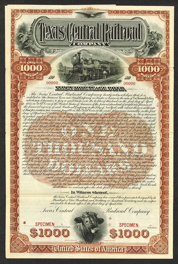 Texas, 1893, $1,000. 1st Mortgage 6% Gold Bond. Green border and underprint locomotive with flagman in middle flanked by cherubs holding up title on top and steer on bottom. ABNC. Specimen w/ coupons, POC's. Rare, Attractive and a great Texas Bond. Only 3 found in the archives. (From a Texas Gentleman's Collection).