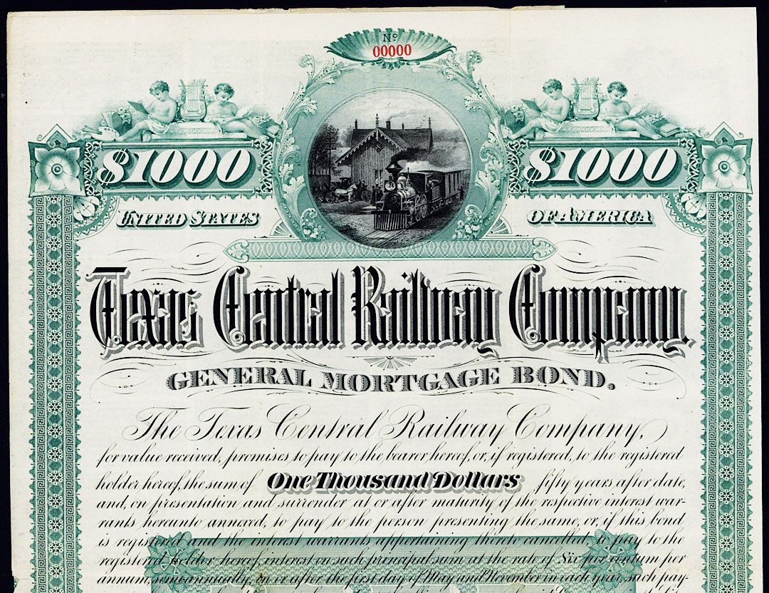 Texas, 1884, $1000, Specimen, General Mortgage 6% bond. Green border. Locomotive leaving station on top and miners and farmers flank Texas Arms on bottom. VF condition. Red specimen overprints, POC's and "00000" serial numbers. Coupons attached. Extremely rare and attractive Texas certificate previously only known as proof. ABNC.