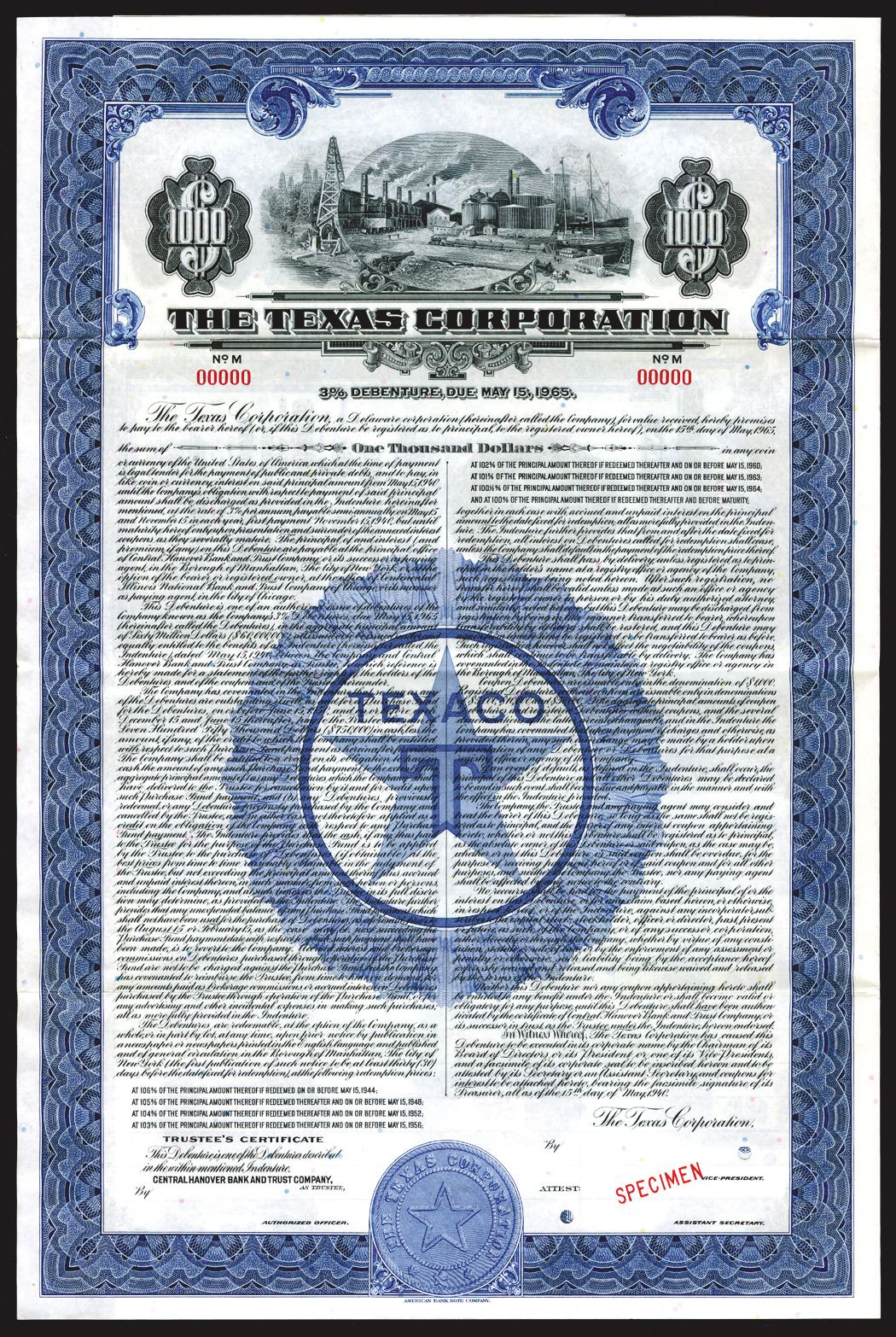 Texas (Inc. in Delaware), 1940. $1000 Specimen 3% Debenture Vertical Coupon Bond, TEXACO Logo as part of underprint, Black text with blue border and undertint, Scene of a large oil refinery at top center. Red specimen overprints, 00000 serial numbers, POCs, VF condition, ABNC. Texaco, Inc. is an American oil subsidiary of Chevron Corporation. Its flagship product is its fuel "Texaco with Techron". It also owns the Havoline motor oil brand. Texaco was an independent company until its refining operations merged into Chevron Corporation in 2001, at which time most of its station franchises were divested to the Shell Oil Company.