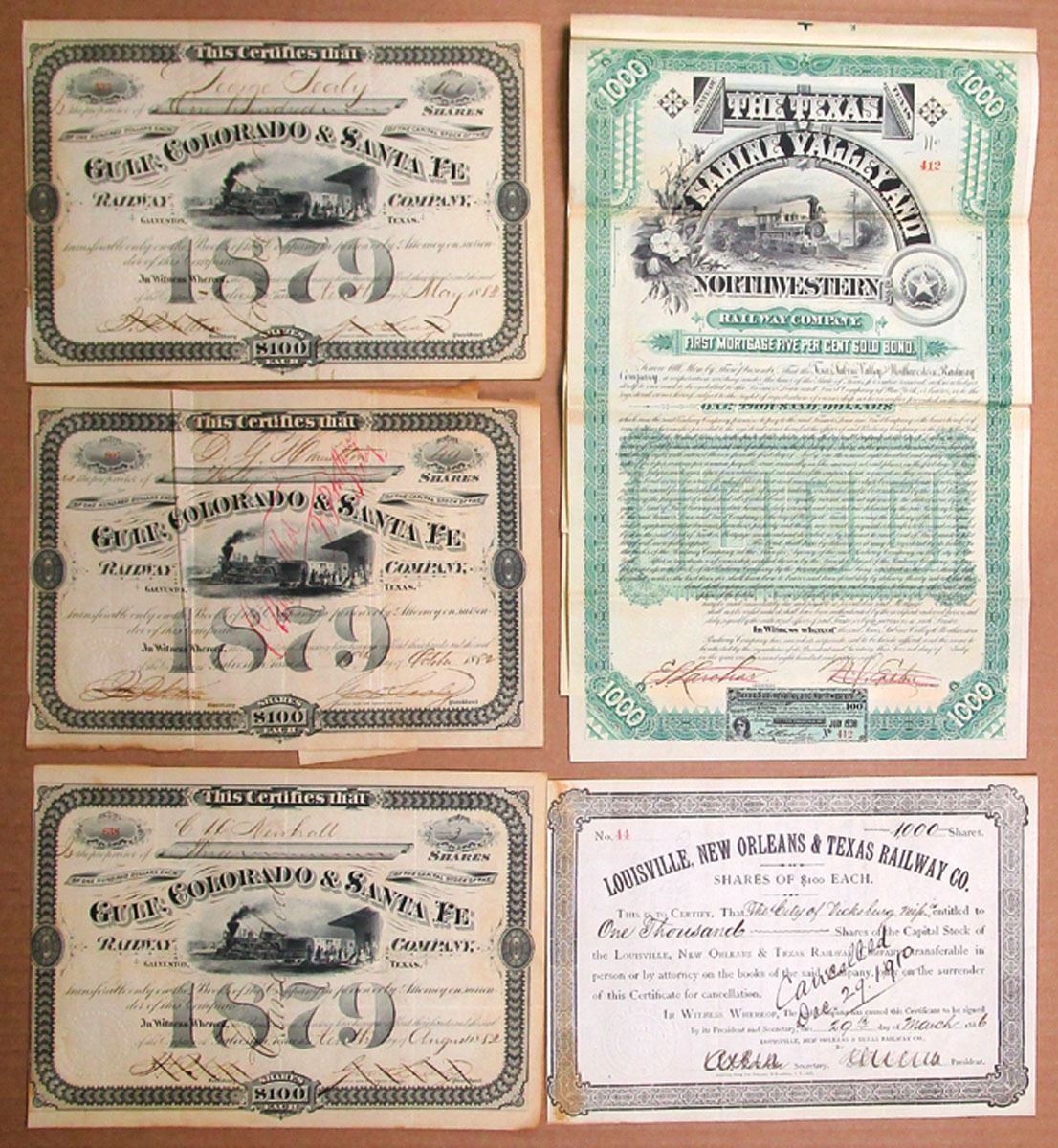Texas & Mississippi....., 1882-88. Lot of 5 I/C Stocks and Bonds, Includes: Gulf, Colorado & Santa Fe Railway Co. (3); Louisville, New Orleans & Texas Railway Co.; Texas, Sabine Valley and Northwestern Railway Co. Certificates range from VF to VF+ condition. (5). Sold "AS IS" no returns accepted.