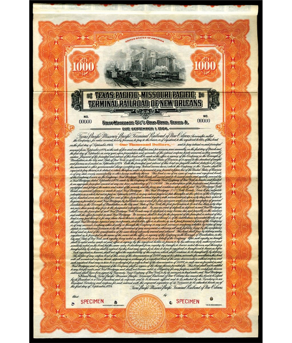 New Orleans, LA. 1924. $1000 1st Mortgage 5 1/2% Gold Bond, Series A Specimen Bond. Orange border and underprint. Locomotives at terminal with warehouses. XF condition. ABNC.