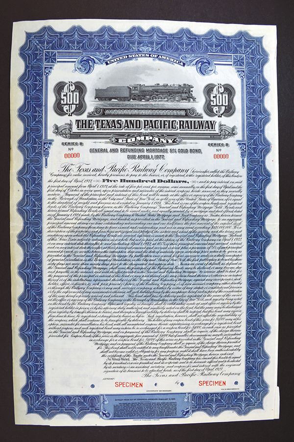Texas. $500 5% Gold Coupon Bond Specimen. 100 Coupons. POCs. ABNC. Coupons at side, 1-1/2 inch cut at top and bottom right between bond and coupon page. Paper tone on left edge. Very Fine.