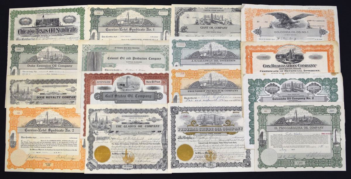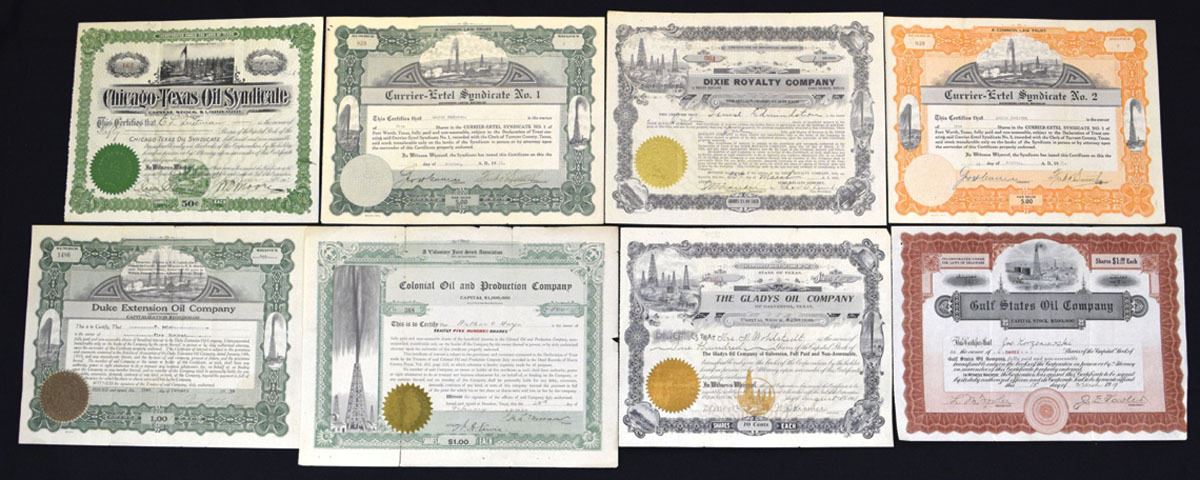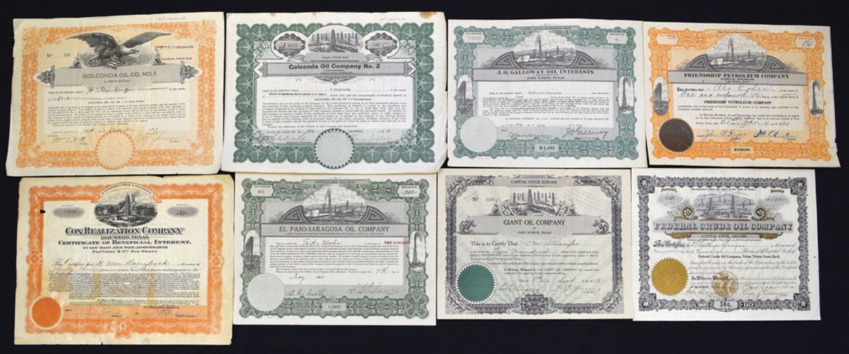 Various States, ca. 1910-30s. Lot of 16 stock certificates, highlights include: Chicago-Texas Oil Syndicate; Currier-Ertel Syndicate No. 1; Currier-Ertel Syndicate No. 2; Giant Oil Company of Fort Worth, Texas; Golconda Oil Co. No. 1; Golconda Oil Company No. 2; Colonial Oil and Production Company; Duke Extension Oil Company; Dixie Royalty Company; Gulf States Oil Company; The Gladys Oil Company of Galveston; J. O. Galloway Oil Interests of Fort Worth, Texas; Friendship Petroleum Company; Cox Realization Company of Houston; El Paso-Saragosa Oil Company; and Federal Crude Oil Company. Condition ranges VF to XF with minor folds, some punch/ink cancellations, and light edge wear. (16). Sold “AS IS” no returns accepted.