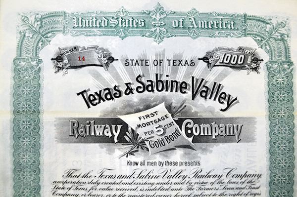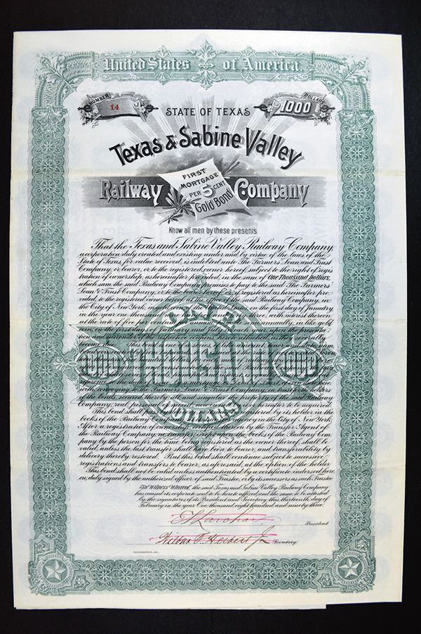 Texas. $1000 5% Gold Coupon Bond. Issued. 2 Coupons Used. Signatures inked over. Low Bond number 14. New York BNC, Litho. Very Fine +