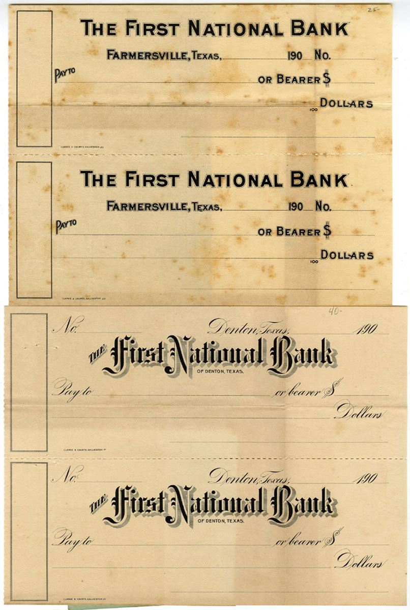 Texas..., ca. 1900-1909. Lot of 2 uncut sheets of 2 checks each from Texas banks, including: Denton, TX, First National Bank, Uncut Proof Check Pair, Black text, VF condition with some toning; and, Farmersville, TX, First National Bank, Uncut Proof Check Pair, Black text, VF condition with foxing and toning. Both have lithograph printing information included on back. (2)