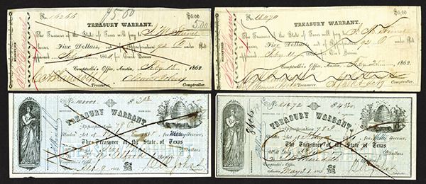 Texas Treasury 2 types, 2 of each. All ink cancelled. Very Fine or better. 4 pieces.