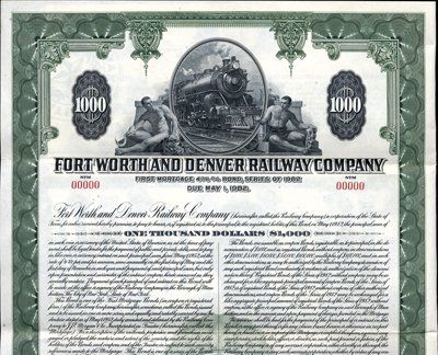 1952. $1,000. Specimen 4 3/8%, 1st Mortgage bond, Series of 1982 with coupons. Green border. Locomotive flanked by allegorical men. XF condition. Rare certificate. ABNC.