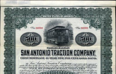 1908. $500. Specimen 1st Mortgage 41 Year, 5% Gold Bond. Green border. Street car. Red specimen overprints, POC's and "00000" serial numbers. XF condition. Rare certificate. Unlisted railroad in Cox. ABNC.