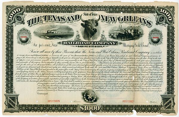 Texas. $1,000 Specimen 6% First Mortgage Gold Coupon Bond, Black print on black border in horizontal format, Steer at top center flanked on either side by a locomotive and horse drawn cart, Specimen overprints and POC's, Fine-VF condition with splitting and archival reinforcements and repairs at fold lines and damage to margins, ABNC. Rare Texas railroad bond.